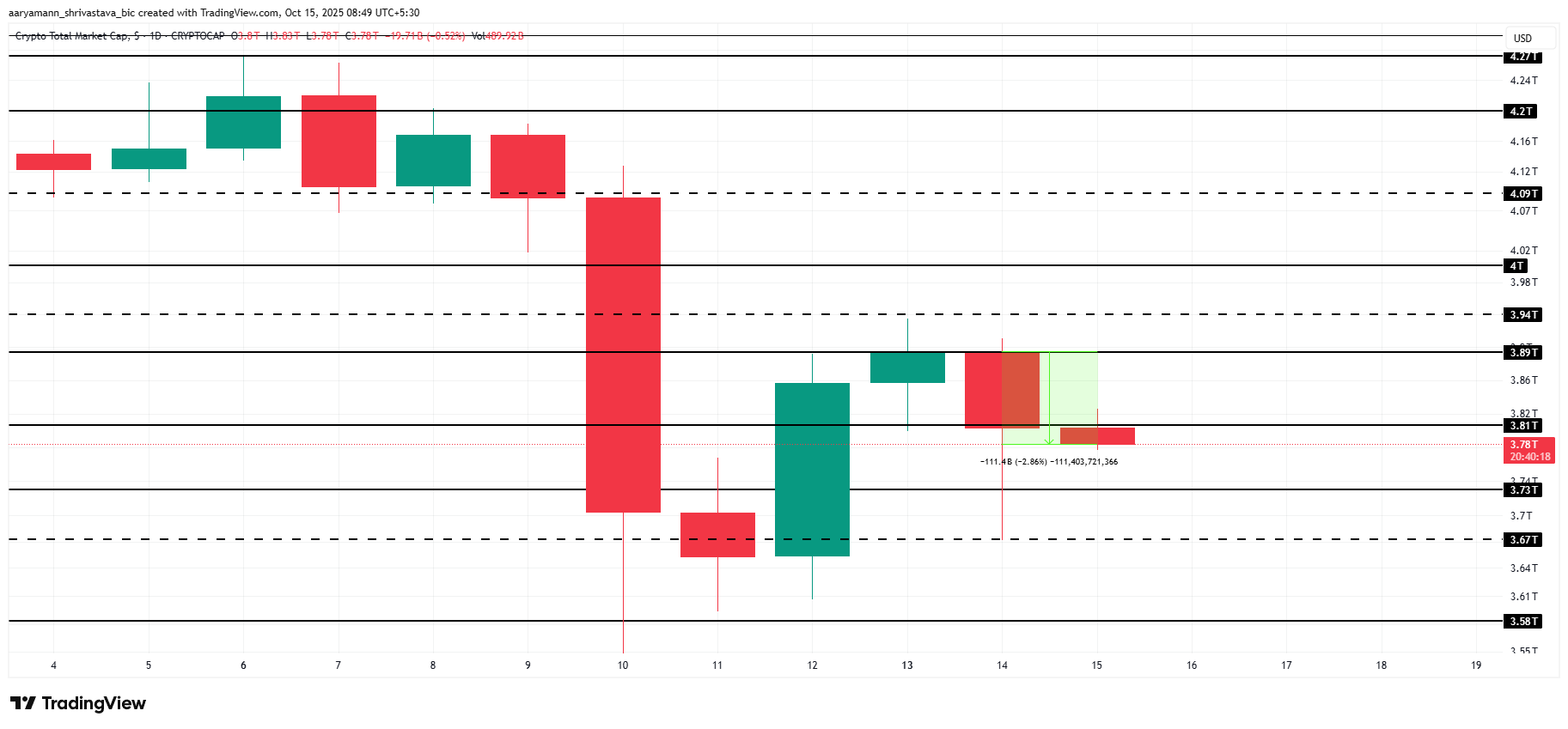 O valor total do mercado de criptomoedas caiu US$ 111 bilhões nas últimas 24 horas, atingindo US$ 3,78 trilhões. O ceticismo persistente entre os investidores continua a impulsionar a pressão de venda.