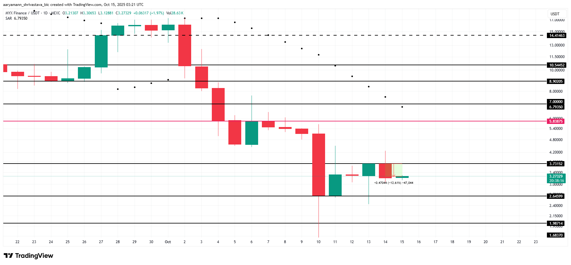 Se a MYX conseguir elevar US$ 3,71 para um nível de suporte estável, a altcoin poderá recuperar o impulso de alta. Um rompimento bem-sucedido acima dessa resistência pode levar a MYX para US$ 4,00 ou mais, marcando uma recuperação significativa e invalidando a perspectiva de baixa predominante.