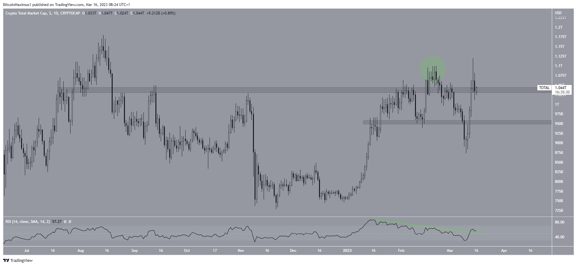 O TOTALCAP iniciou um movimento de alta em 10 de março e atingiu uma nova máxima anual de US$ 1,12 trilhão quatro dias depois. Embora o preço tenha caído desde então, ele ainda é negociado dentro da área horizontal de US$ 1,04 trilhão.