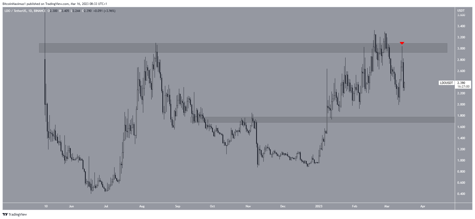 O preço do Lido DAO (LDO) está em queda desde 14 de março, quando foi rejeitado pela área de resistência de US$ 3. Se a queda continuar, o preço pode cair para a área de suporte mais próxima em US$ 1,75.
