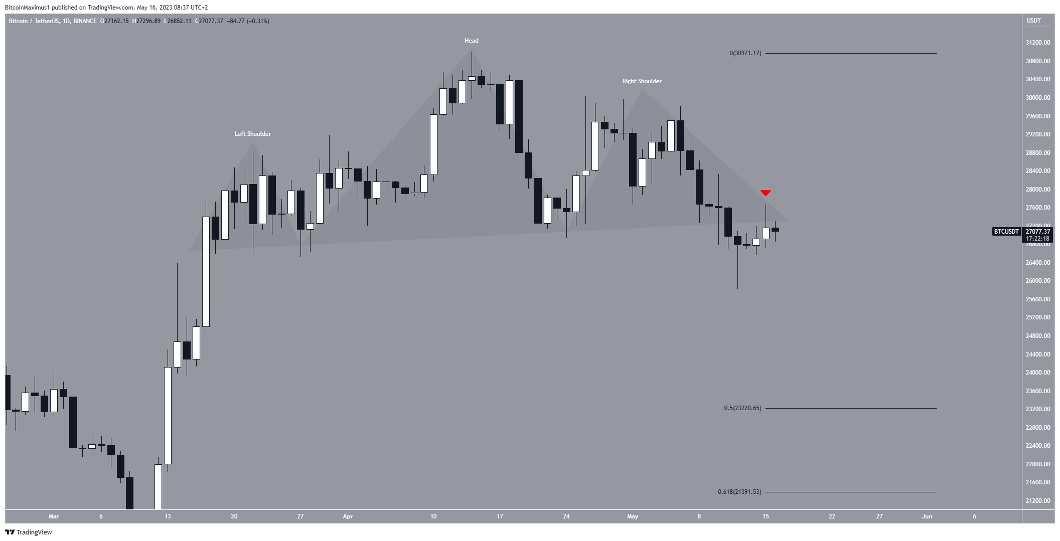 O Bitcoin caiu de um padrão de ombro-cabeça-ombro em 11 de maio. O preço então caiu para uma mínima de US$ 25.811 no dia seguinte.