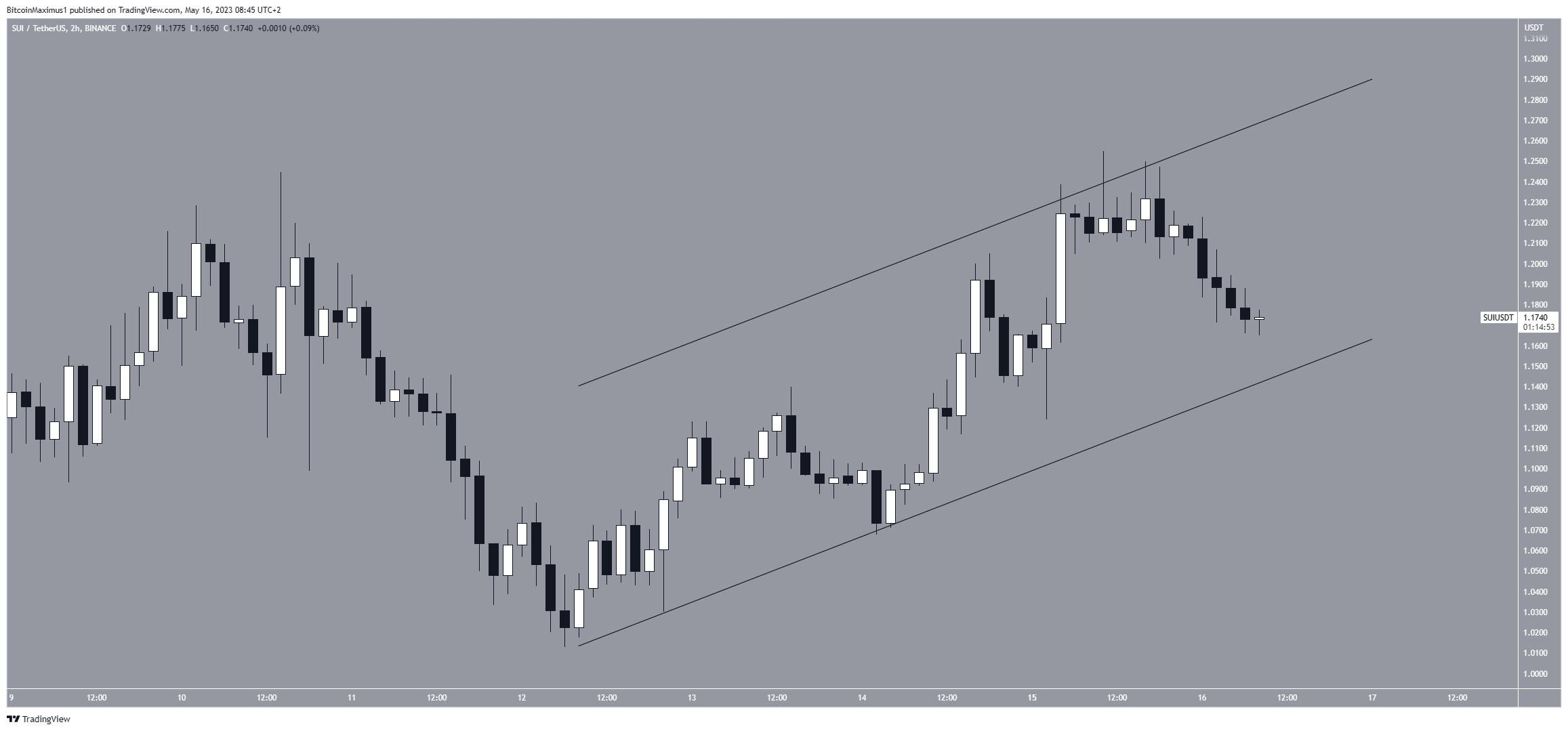 O preço do SUI está em um canal paralelo alta desde 12 de maio. O canal é considerado um padrão de baixa, o que significa que um eventual rompimento de baixa dele seria o cenário mais provável.