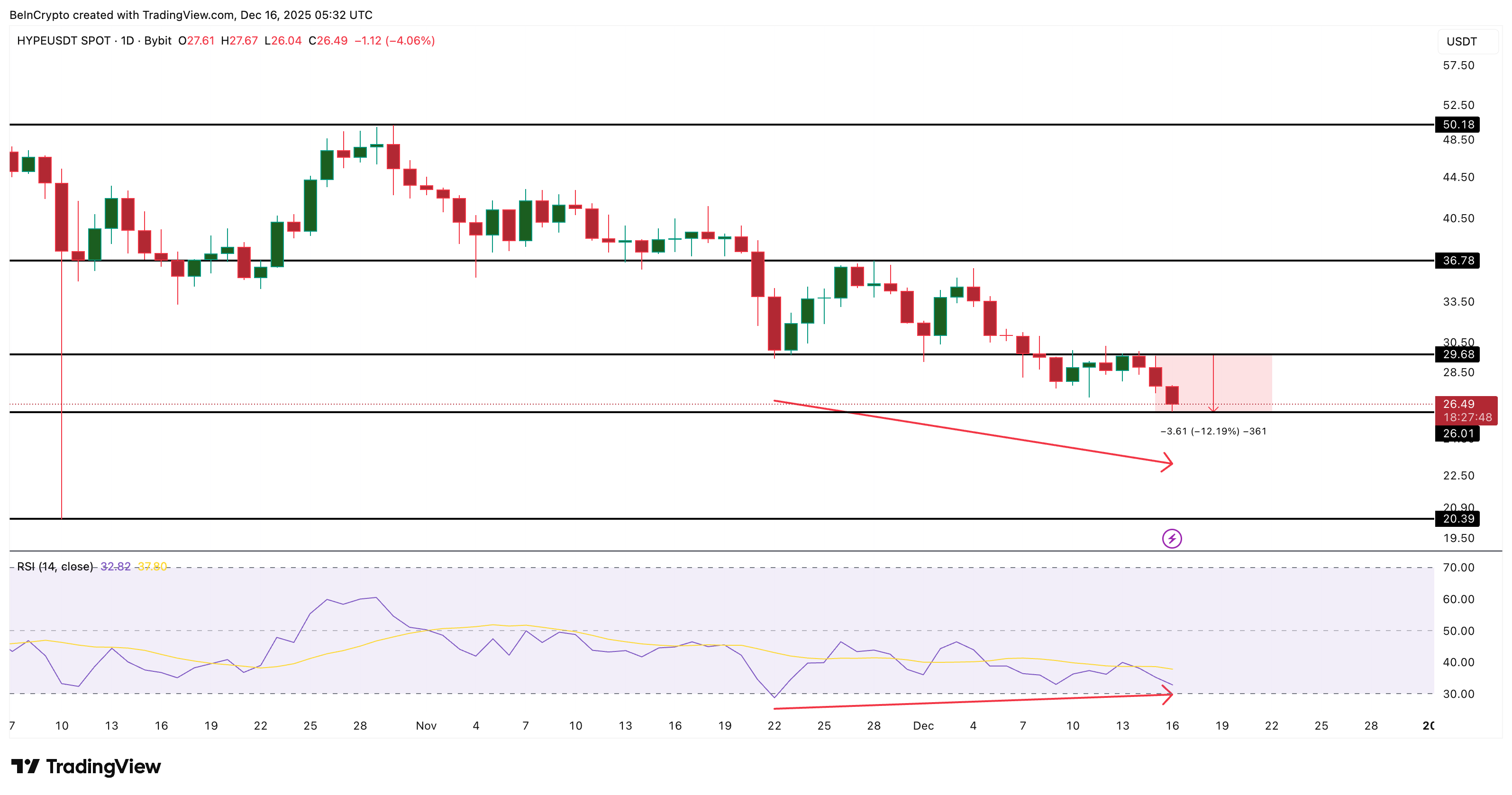 A ação do preço continua em tendência de baixa, mas o gráfico diário começa a mostrar sinais iniciais de exaustão. Entre 22 de novembro e 16 de dezembro, o preço do HYPE registrou uma mínima mais baixa, enquanto o Índice de Força Relativa (IFR), uma ferramenta de momentum, formou uma mínima mais alta. Essa divergência de alta padrão sugere que a pressão vendedora pode estar diminuindo, embora ainda não haja confirmação.