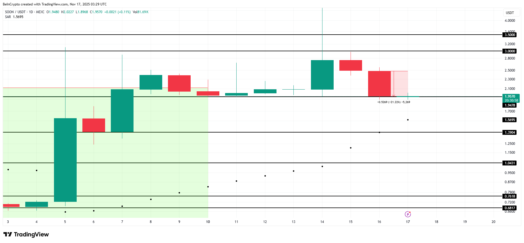 As ações da SOON caíram 21% nas últimas 24 horas e agora estão cotadas a US$ 1,95. A perda do suporte de US$ 1,94 pode desencadear uma correção mais profunda, potencialmente levando o preço para US$ 1,39, à medida que a pressão vendedora aumenta em todo o mercado.