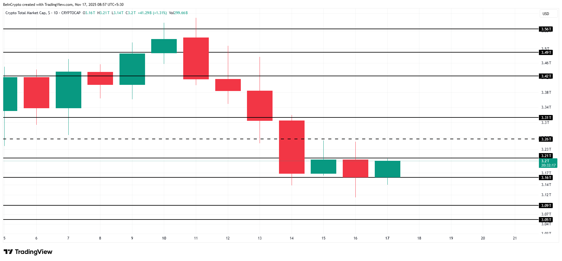 Se a TOTAL ultrapassar a resistência de US$ 3,21 trilhões, a capitalização de mercado poderá subir para US$ 3,26 trilhões. Um impulso sustentado poderá impulsioná-la ainda mais para US$ 3,31 trilhões, sinalizando maior confiança e demanda mais forte entre as principais criptomoedas.