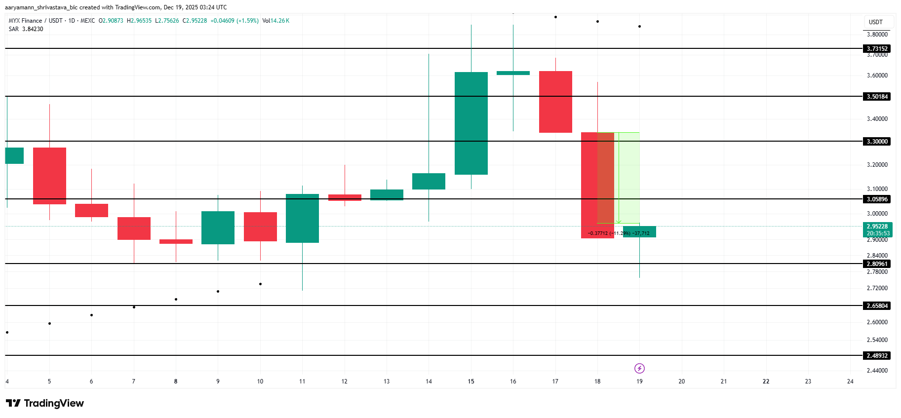 Os indicadores técnicos apontam para um risco contínuo de queda. O SAR Parabólico confirma uma tendência de baixa mais forte. Se a pressão persistir, o MYX poderá cair em direção ao suporte de US$ 2,80. Uma queda abaixo desse nível pode expor o preço a US$ 2,65, aumentando as perdas e reforçando o ímpeto de baixa no curto prazo.