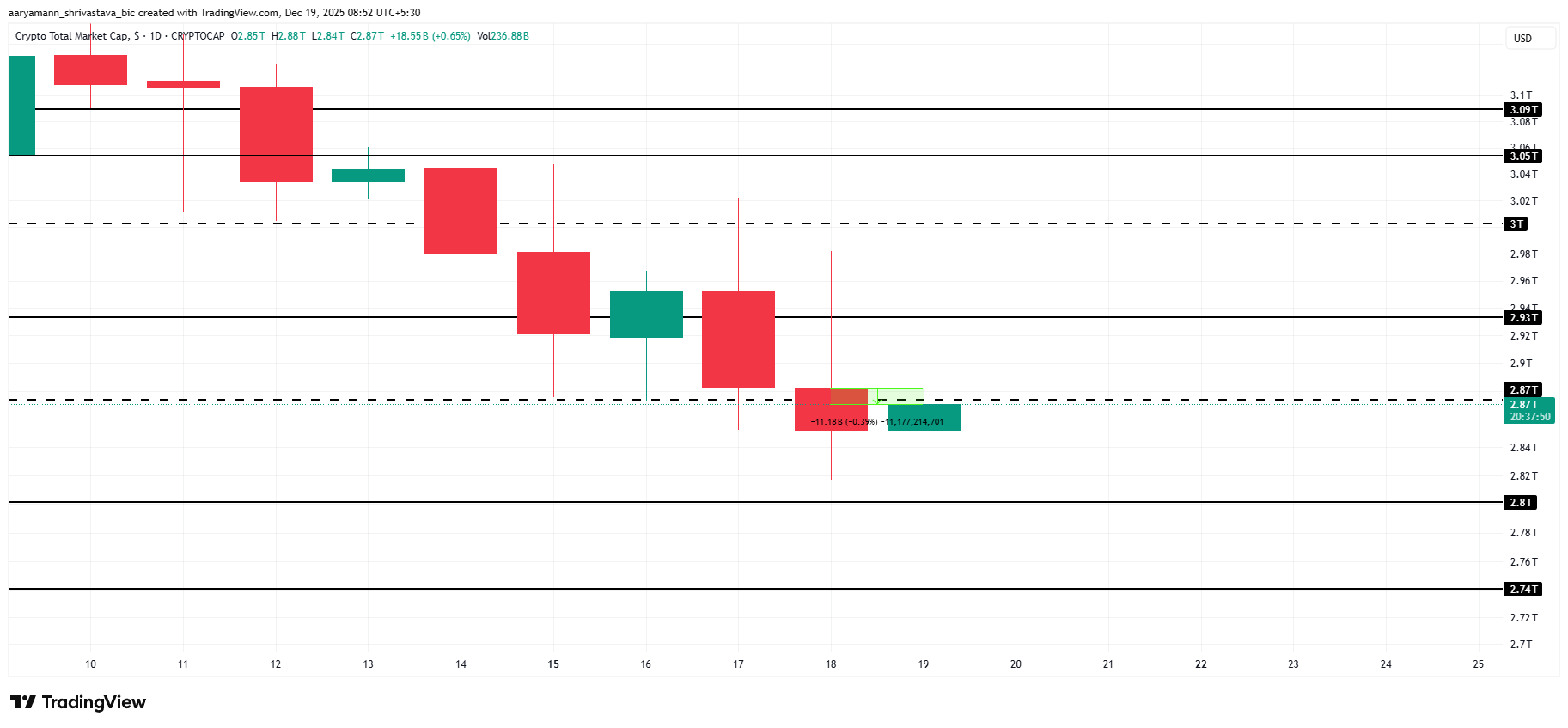 A TOTAL está se consolidando em torno do nível de US$ 2,87 trilhões, testando-o como resistência e suporte. Essa faixa de negociação sugere incerteza. Se a pressão vendedora se intensificar, a capitalização de mercado poderá recuar para US$ 2,80 trilhões, expondo perdas mais amplas e reforçando os riscos de queda no curto prazo.
