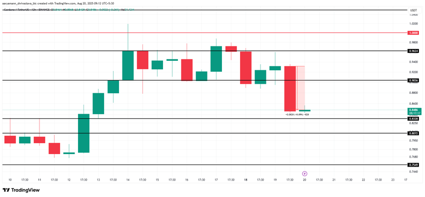 A Cardano sofreu uma forte queda de 9% nas últimas 24 horas, sendo negociada a US$ 0,84. A altcoin perdeu o suporte crítico de US$ 0,90, o que gerou preocupações crescentes entre os investidores. A queda no preço é atribuída à fraqueza geral do mercado, que está afetando muitas criptomoedas.