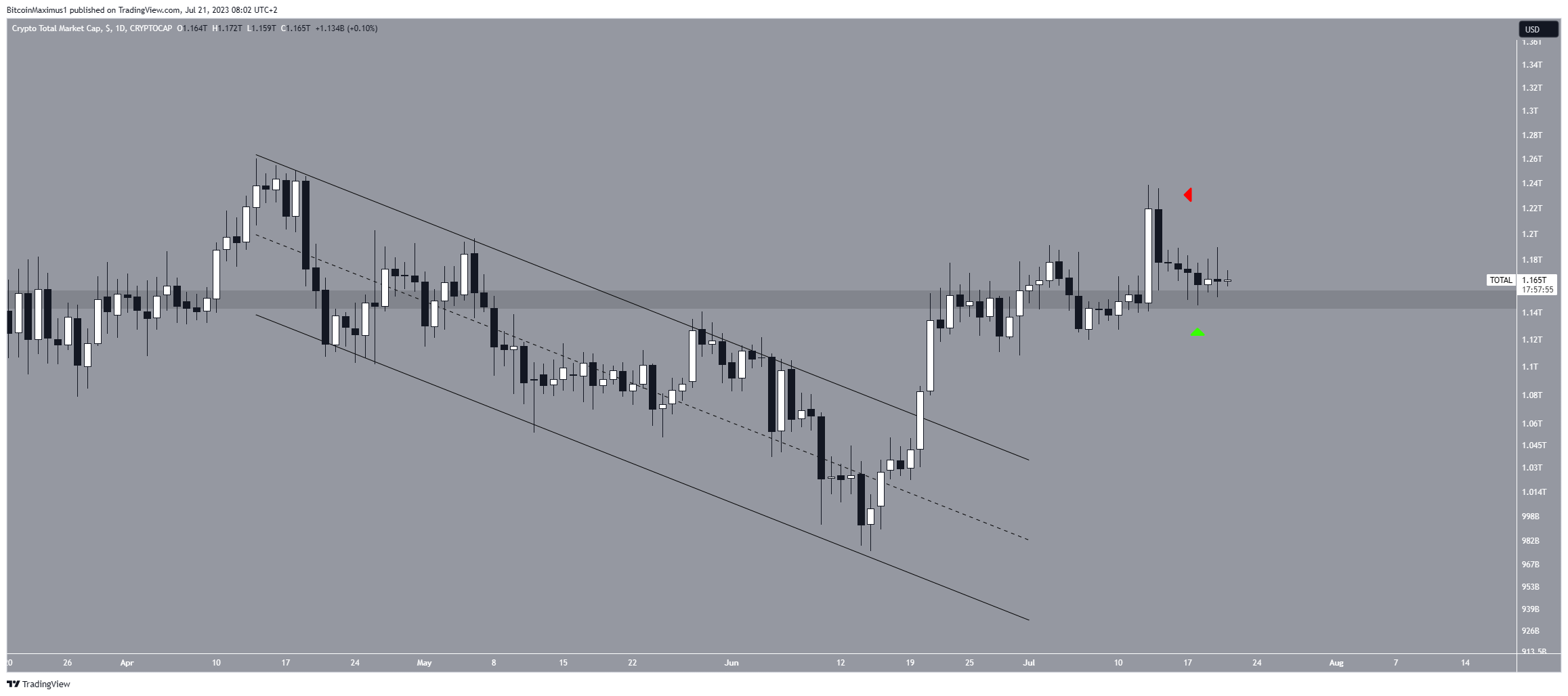 A partir de 15 de junho, houve um aumento significativo no TOTALCAP. Em 20 de junho, o preço ultrapassou um canal paralelo de baixa e conseguiu romper a zona de resistência de US$ 1,15 trilhão após 10 dias. Em 13 de julho, quase atingiu uma nova máxima anual, apesar de experimentar um declínio acentuado imediatamente depois (ícone vermelho).