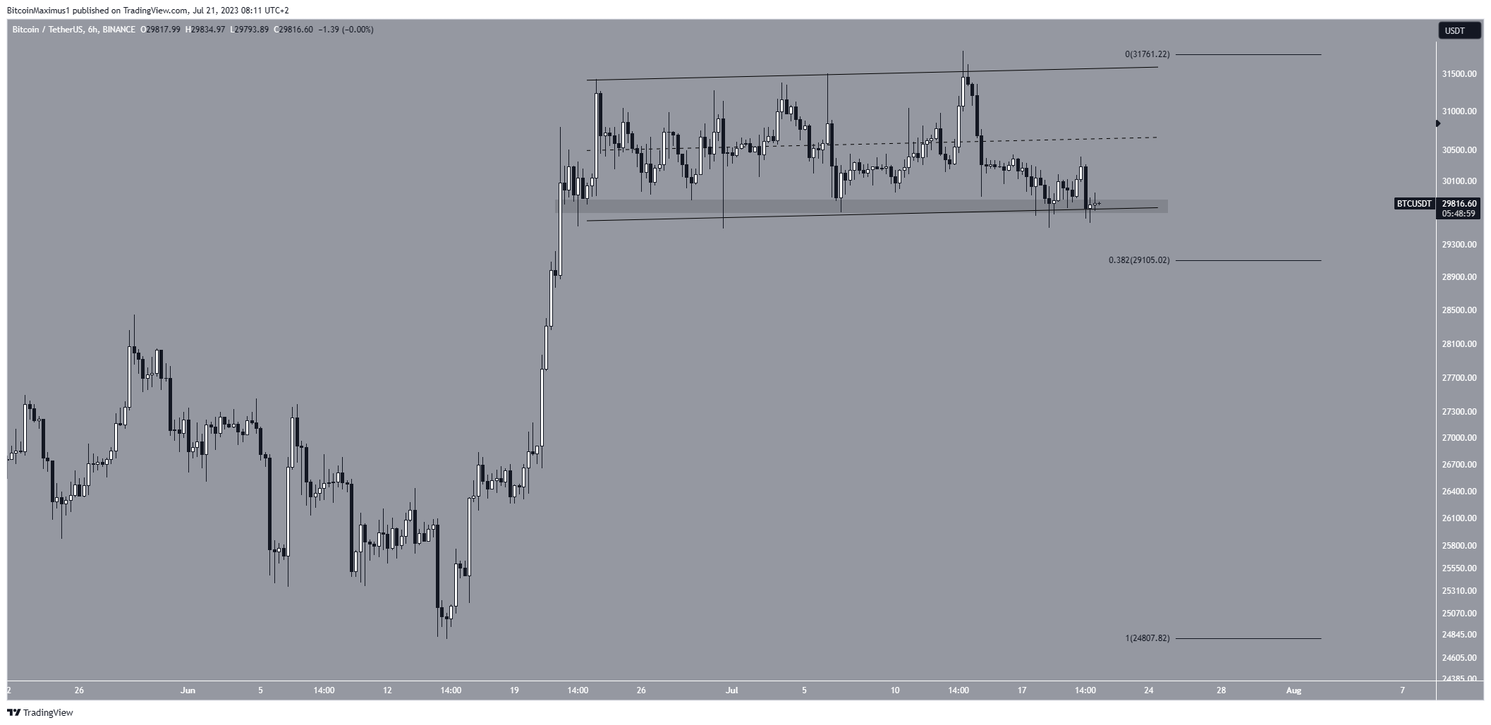 Se houver um movimento de alta, há uma chance de o preço subir em direção à linha média do canal e potencialmente atingir a linha de resistência em US$ 31.500. Por outro lado, se o BTC seguir em queda, espera-se que caia para US$ 29.100. O nível de retração 0,382 de Fibonacci estabelece esse nível de suporte.