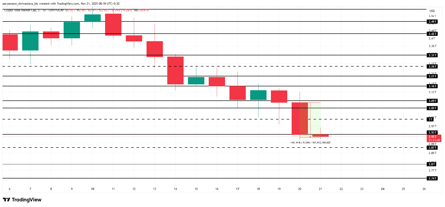 A capitalização total do mercado de criptomoedas caiu US$ 161 bilhões nas últimas 24 horas, recuando para US$ 2,92 trilhões, em meio à intensificação da pressão macrofinanceira. O sentimento generalizado de aversão ao risco está impulsionando a queda, com investidores reduzindo a exposição a diversos ativos importantes em meio à crescente incerteza nos mercados globais.