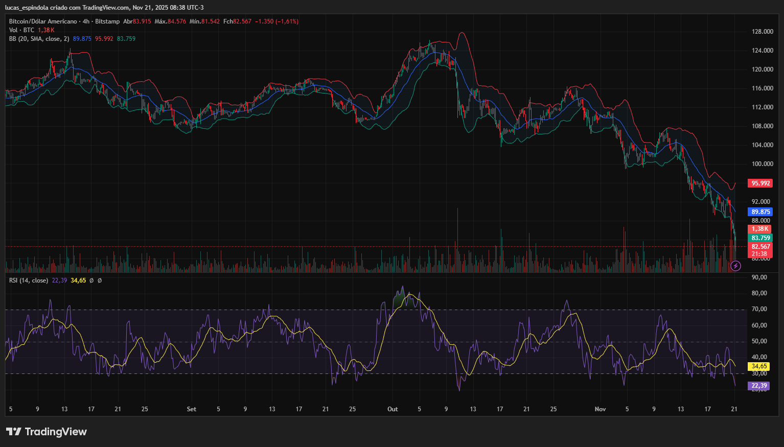 O Bitcoin caiu quase 6% nas últimas 24 horas e agora está cotado a US$ 82.500. No entanto, o sentimento permanece instável, com o aumento da volatilidade e os investidores reavaliando o risco em relação aos principais ativos.