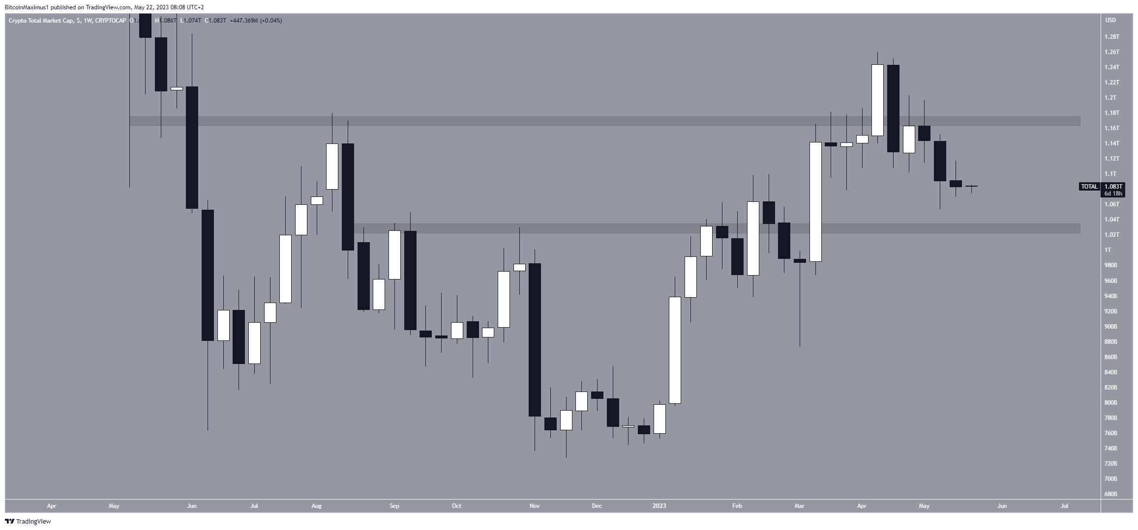 O TOTALCAP está em queda desde sua máxima anual de US$ 1,26 trilhão em abril. A queda levou o preço abaixo da área horizontal de US$ 1,17 trilhão, que agora atua como resistência. Após isso, o preço criou três candles de baixa consecutivos.