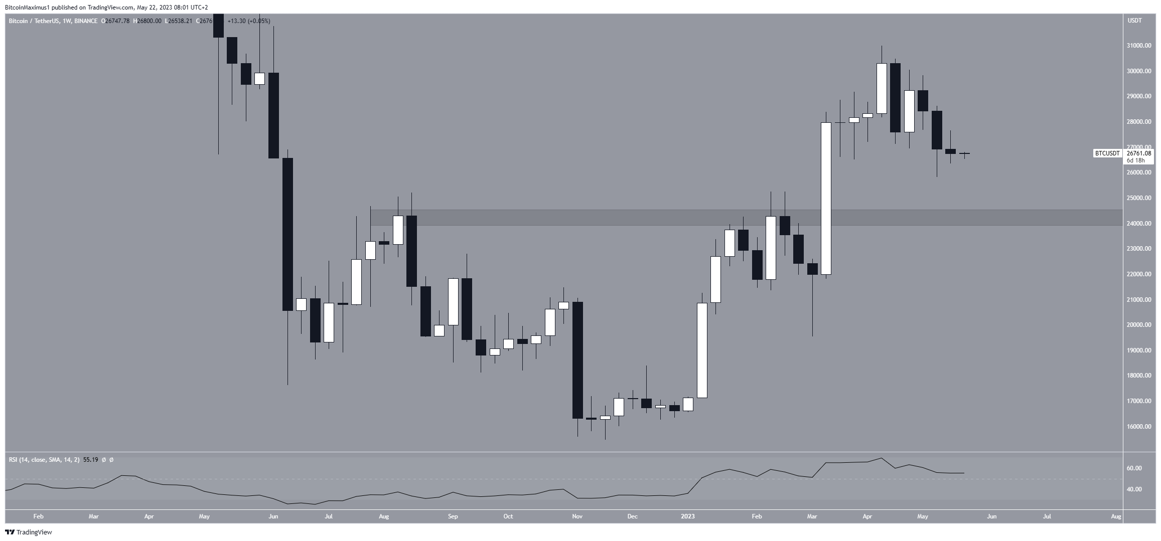 O preço do Bitcoin caiu desde sua máxima anual de US$ 31.000 em abril. Na semana passada, criou o terceira candle de baixa consecutivo. No entanto, o candle não era muito significativo em tamanho.