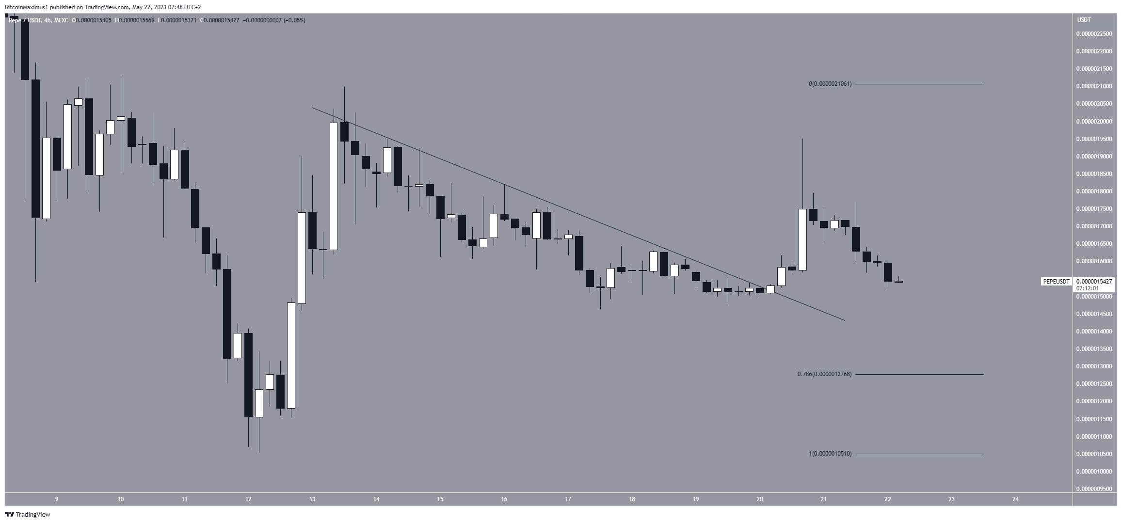 O preço da PEPE saiu de uma linha de tendência de baixa em 20 de maio. O rompimento levou a uma máxima de US$ 0,0000020 no mesmo dia.