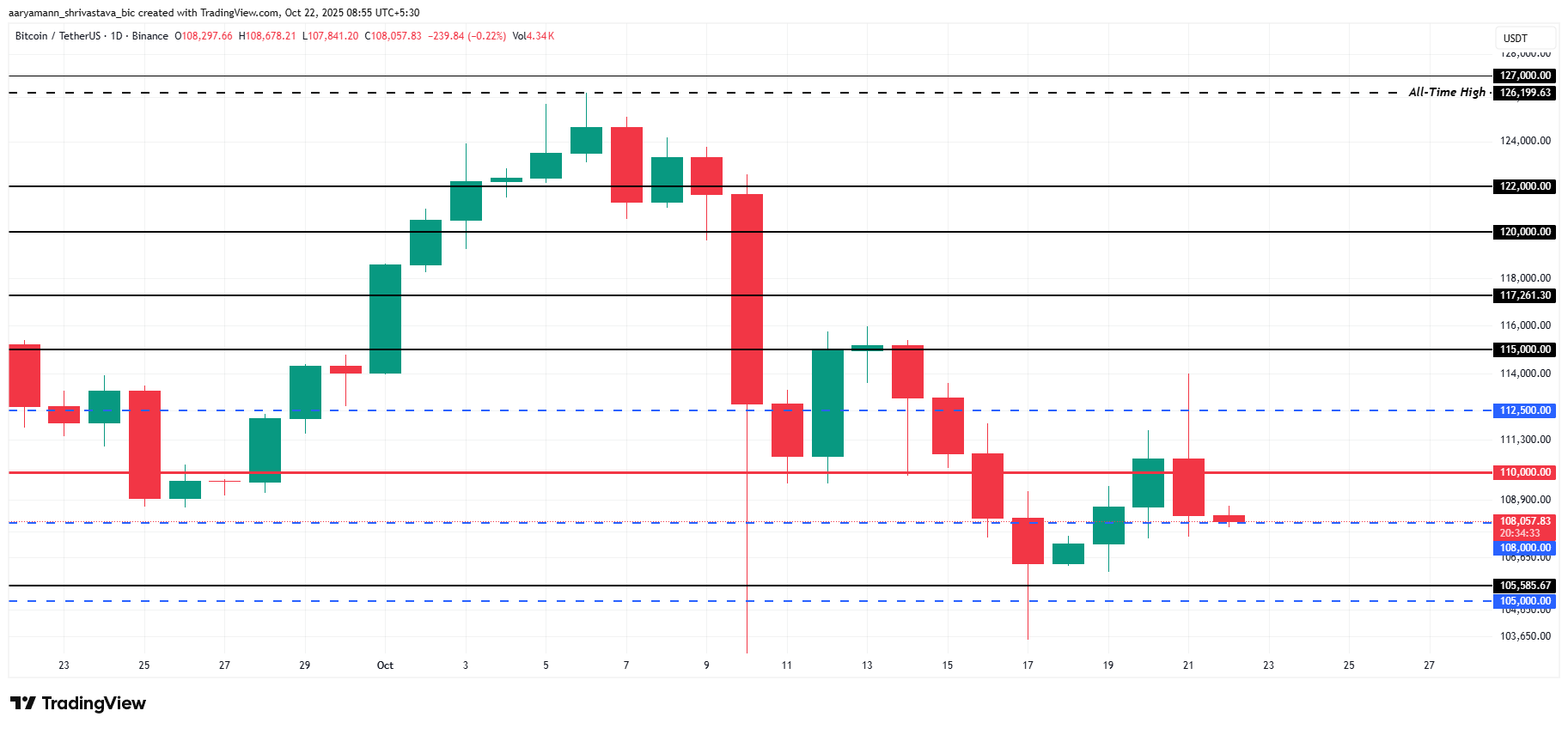 O preço do Bitcoin pode invalidar a perspectiva de baixa se recuperar da zona de suporte de US$ 108 mil. Uma recuperação em direção a US$ 110 mil indicaria uma confiança renovada do comprador e uma potencial estabilização. Um momentum sustentado acima desse nível pode restaurar o sentimento de alta no curto prazo.