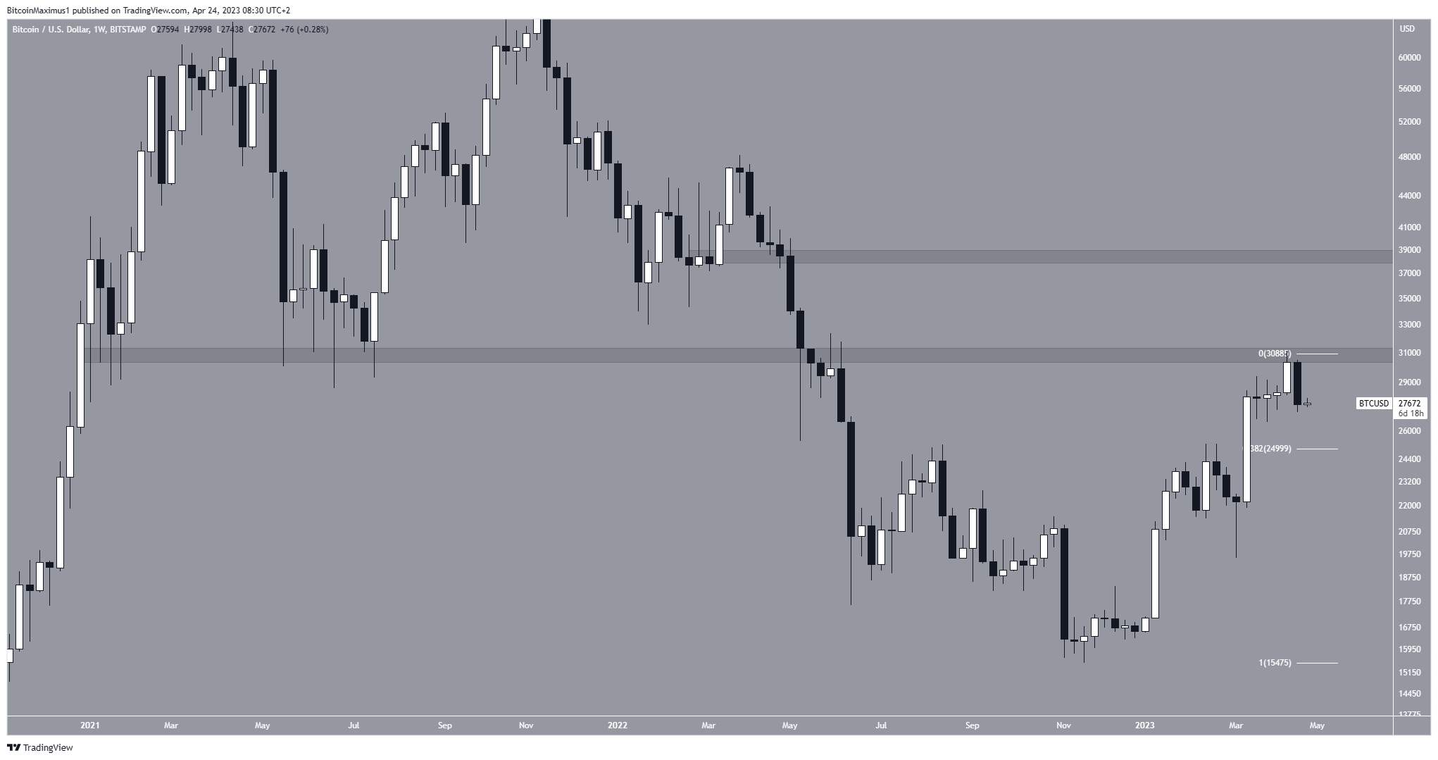 O preço do Bitcoin caiu drasticamente na semana passada e, de forma semelhante ao TOTALCAP, criou um candle engolfo de baixa. O fato de o candle ter sido criado dentro da área de resistência de US$ 31.000 aumenta ainda mais sua importância.
