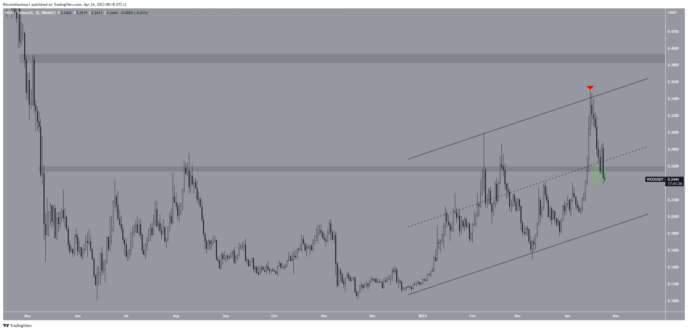 O preço do WOO caiu desde que foi rejeitado pela linha de tendência de baixa de um canal paralelo de alta em 15 de abril (ícone vermelho). Quando tais canais contêm movimentos de preço, ele salta entre as linhas de resistência e suporte do padrão várias vezes antes que um movimento decisivo ocorra.