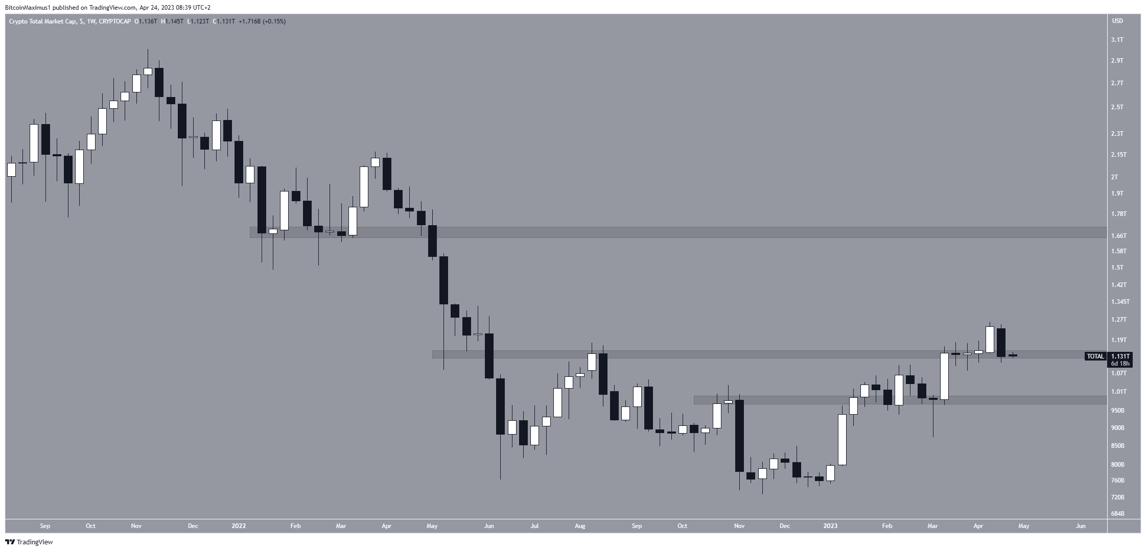 O valor total do mercado de criptomoedas (TOTALCAP) e o Bitcoin (BTC) criaram candles de baixa de longo prazo. A WOO Network (WOO) caiu abaixo de uma importante área de resistência horizontal.