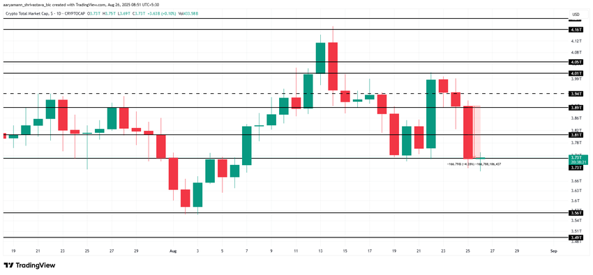 Apesar da recente queda, o TOTAL permanece acima da zona de suporte de US$ 3,73 trilhões, dando aos investidores a chance de retomar o controle. O mercado pode avançar para US$ 3,81 trilhões se os preços baixos atraírem novos investidores. Uma recuperação sugere que os investidores ainda veem forte valor nas principais criptomoedas nos níveis atuais.