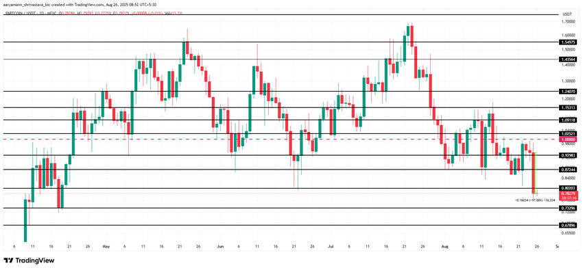 O preço da FARTCOIN caiu 17% nas últimas 24 horas, chegando a US$ 0,78. Isso marca a mínima em quatro meses para a altcoin, após ela ter perdido o suporte de US$ 0,80. A queda reflete a forte pressão de venda, empurrando a criptomoeda abaixo de um patamar importante que havia mantido a estabilidade por várias sessões consecutivas de negociação.