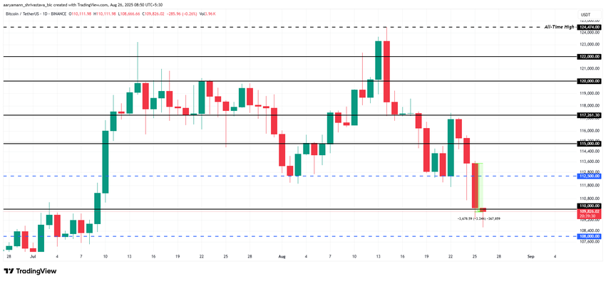 O preço do Bitcoin caiu 3,2% nas últimas 24 horas, caindo abaixo de US$ 110 mil pela primeira vez em um mês. O gigante das criptomoedas agora é negociado a US$ 109.826, refletindo o aumento da pressão de venda.