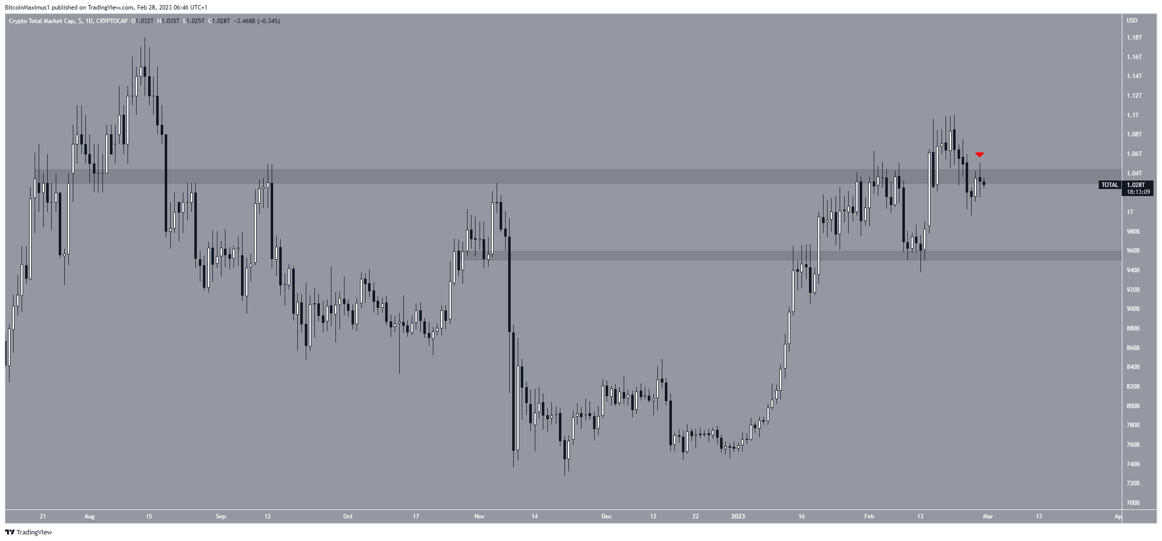 O TOTALCAP caiu desde que atingiu uma alta de US$ 1,10 trilhão em 21 de fevereiro. O movimento fez com que a capitalização perdesse a área de suporte de US$ 1,04 trilhão. Então, validou a área como resistência na última segunda-feira (27). A não recuperação dessa área pode levar à continuação do movimento de queda para US$ 955 bilhões.