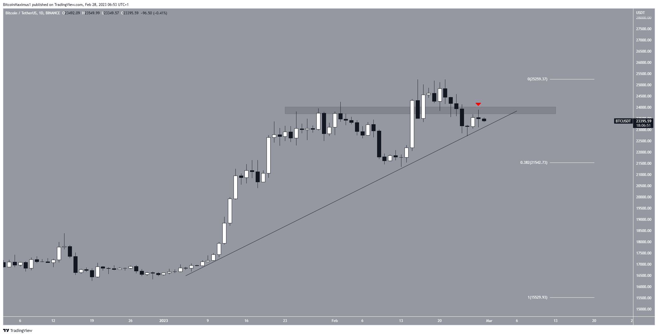 O preço do Bitcoin subiu ao lado de uma linha de tendência de alta desde o início do ano. Embora tenha atingido uma alta de US$ 25.250 em 16 de fevereiro, caiu abaixo da área de suporte horizontal de US$ 24.000 logo depois. Ele validou a área como resistência (ícone vermelho) nas últimas 24 horas.
