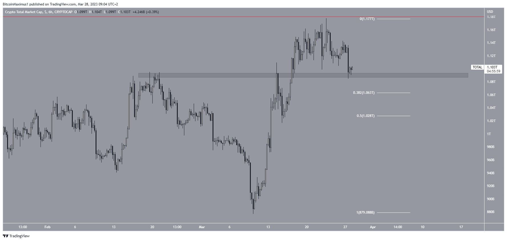 Uma queda provavelmente levaria para os níveis de retração de 0,382-0,5 de Fibonacci em US$ 1,03-1,06 trilhão. Por outro lado, um salto levaria a um aumento para US$ 1,17 trilhão.