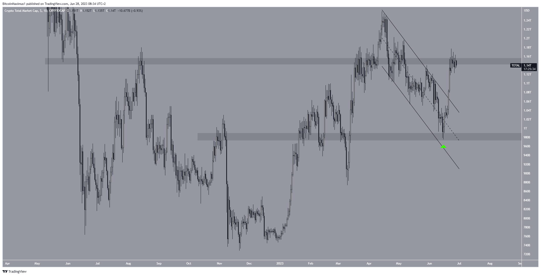 O TOTALCAP saltou acentuadamente em 15 de junho, validando o nível de US$ 980 bilhões como suporte. Cinco dias depois, saiu de um canal paralelo de baixa, culminando com uma alta de US$ 1,17 trilhão em 23 de junho.