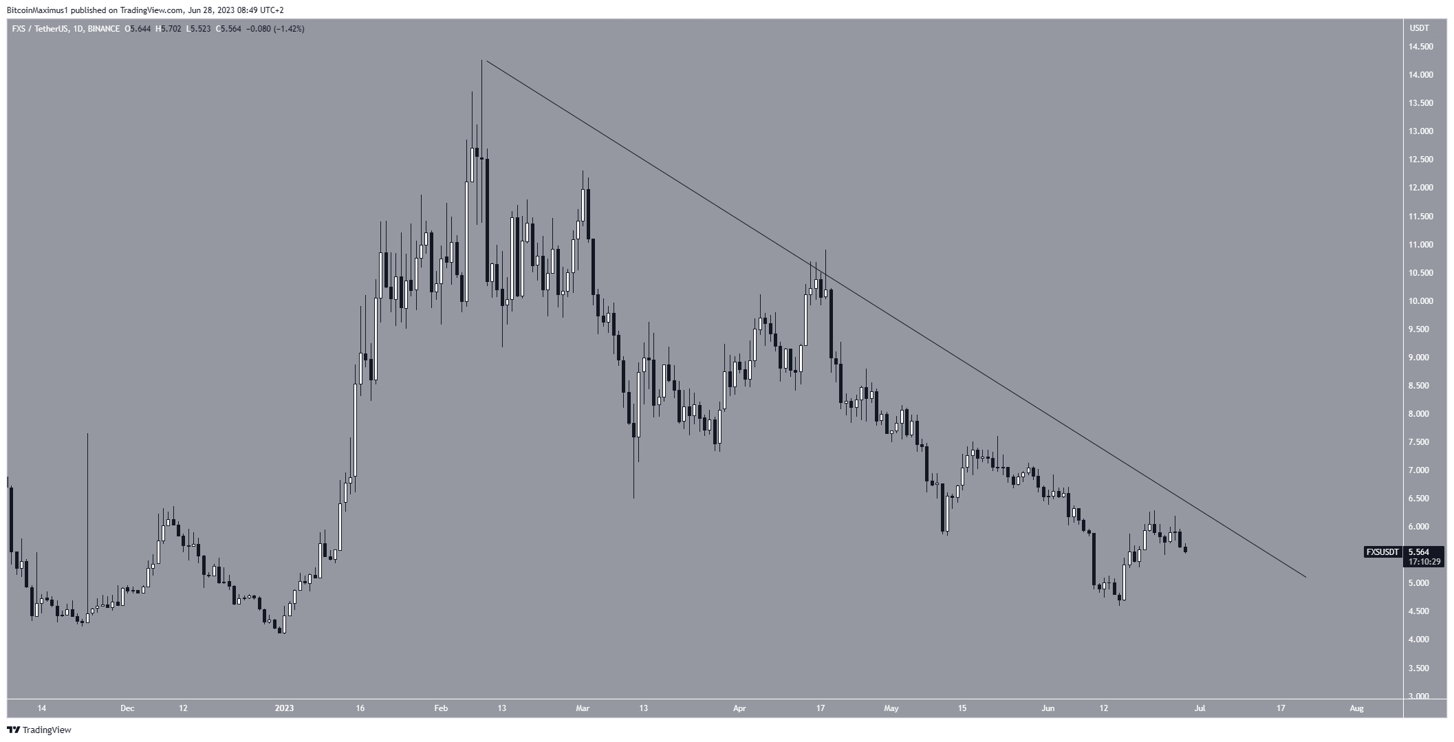 Embora o preço do FXS tenha subido posteriormente, ele ainda não atingiu a linha de tendência de baixa.