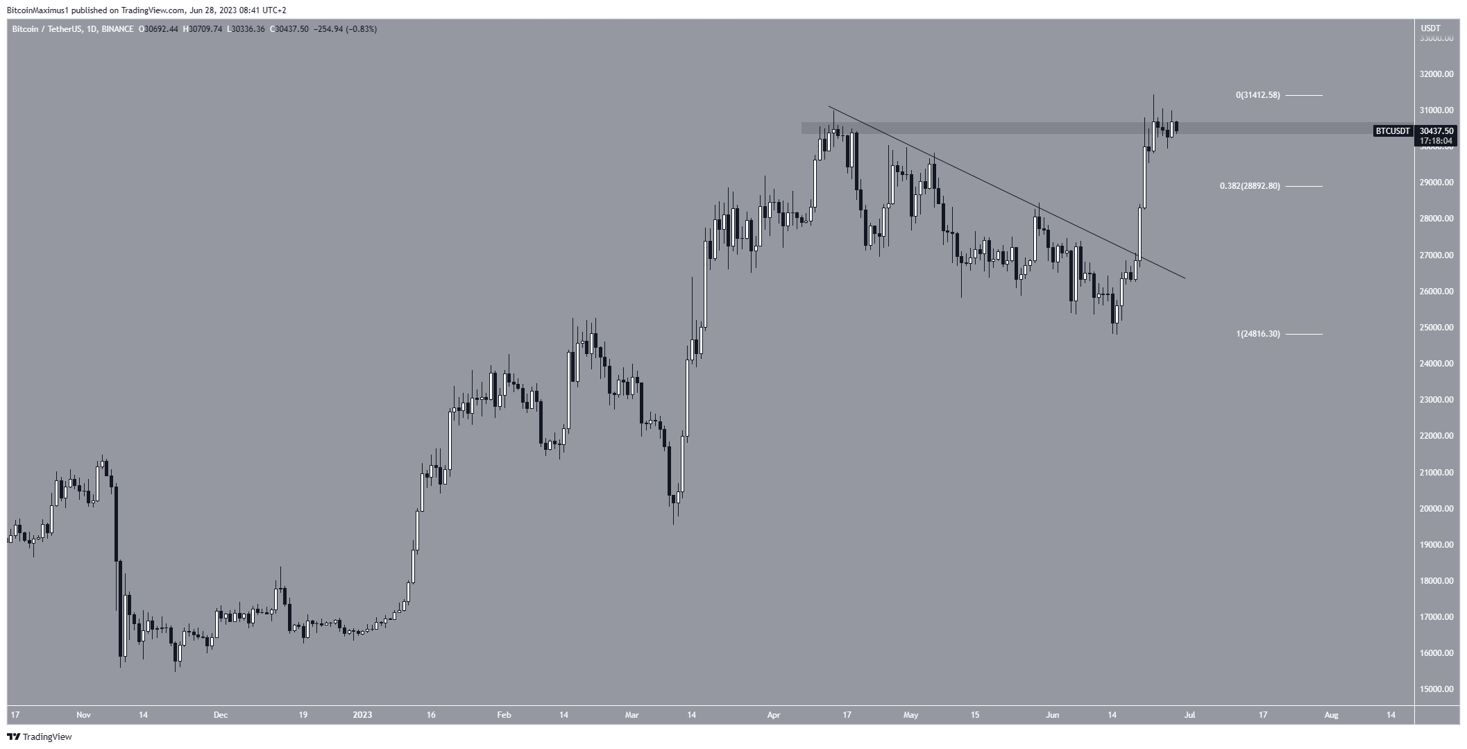 O preço do Bitcoin saiu de uma linha de tendência de baixa em 20 de junho e atingiu uma nova máxima anual de US$ 31.431 três dias depois. No entanto, o preço não fechou acima da área de resistência de US$ 30.400, apesar do rompimento. Em vez disso, está lutando contra isso e pode potencialmente cair.