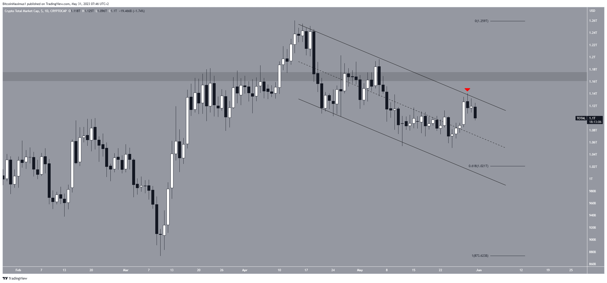 O TOTALCAP caiu desde que desviou acima da área de resistência de US$ 1,17 trilhão em 14 de abril. A queda assumiu a forma de um canal paralelo de baixa, que é considerado um padrão de alta. Como resultado, é provável que o preço saia dele.