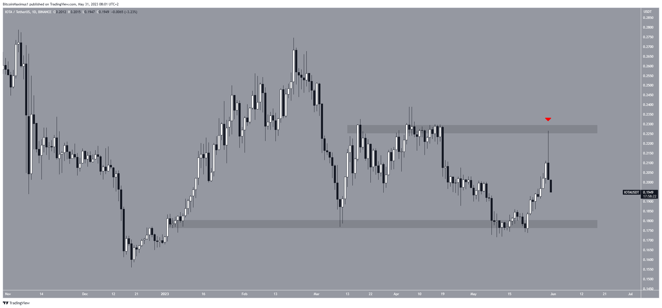 A IOTA foi rejeitada pela área de resistência horizontal de US$ 0,23 em 30 de maio. Por sua vez, isso criou um longo pavio superior (ícone vermelho), considerado um sinal de pressão de venda. O preço agora é negociada abaixo de US$ 0,20.