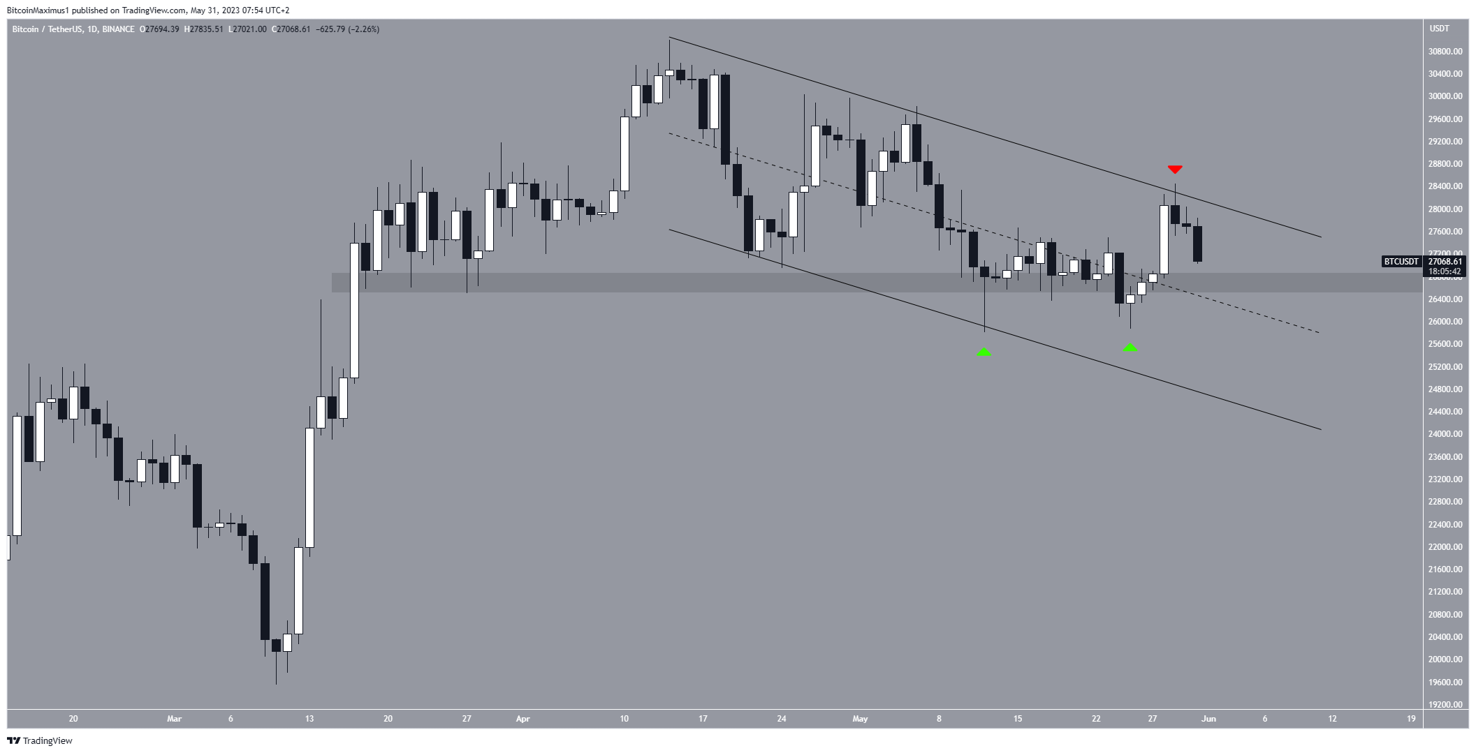 O Bitcoin foi rejeitado pela linha de resistência de um canal paralelo de baixa. Posteriormente, a queda acelerou em 31 de maio. O preço agora está se aproximando da área de suporte horizontal de US$ 26.700.