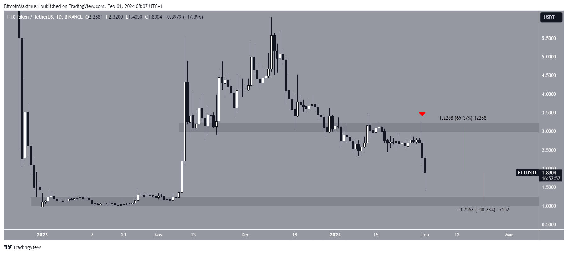O FTT caiu desde que atingiu US$ 6,06 em 10 de dezembro de 2023. A queda causou um rompimento da área horizontal de US$ 3,10.