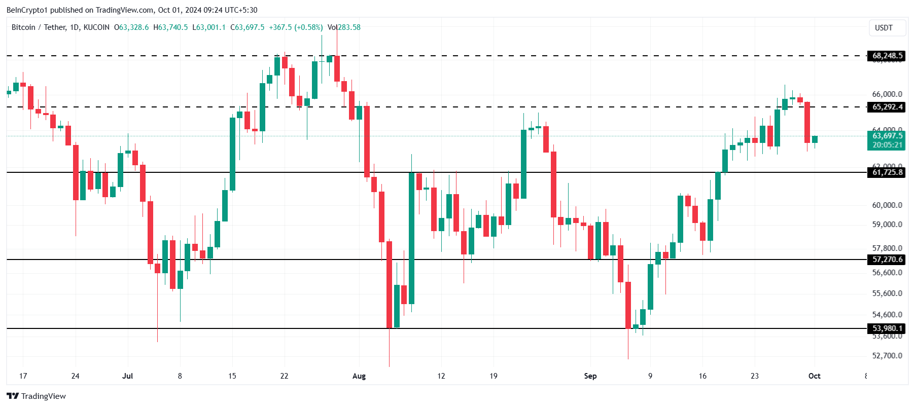 O Bitcoin está atualmente em US$ 63.697, tendo perdido o nível de suporte crucial de US$ 65.292. A criptomoeda agora está tentando recuperar esse nível-chave, enquanto os investidores observam de perto. Esse declínio repentino levantou preocupações, mas o ativo ainda tem uma chance de se recuperar se conseguir recuperar o suporte perdido.