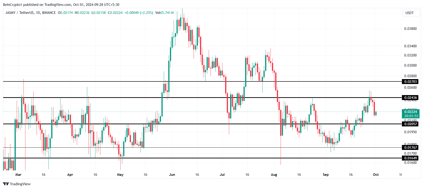 No entanto, considerando as condições atuais, um declínio para o suporte crucial de US$ 0,020 é possível. A única maneira de invalidar essa perspectiva de baixa é a JASMY garantir US$ 0,024 como um piso de suporte.