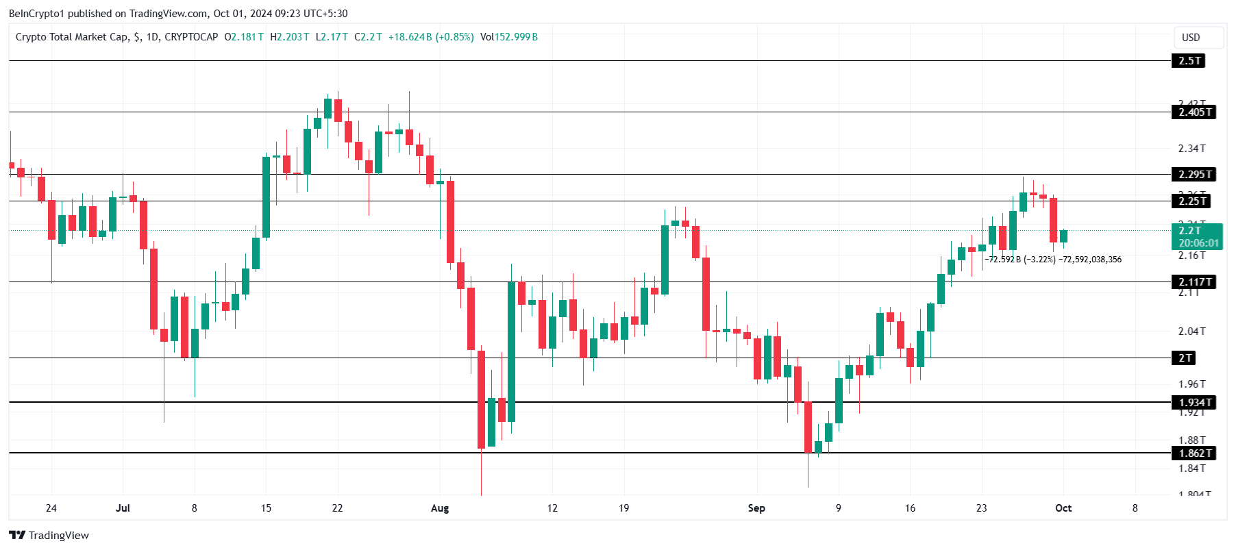 A capitalização total do mercado de criptomoedas está atualmente em US$ 2,20 trilhões, após perder mais de US$ 72 bilhões em 24 horas. Essa queda significativa fez com que o TOTALCAP rompesse o nível de suporte crucial de US$ 2,25 trilhões, levando a uma onda de incerteza entre os investidores.
