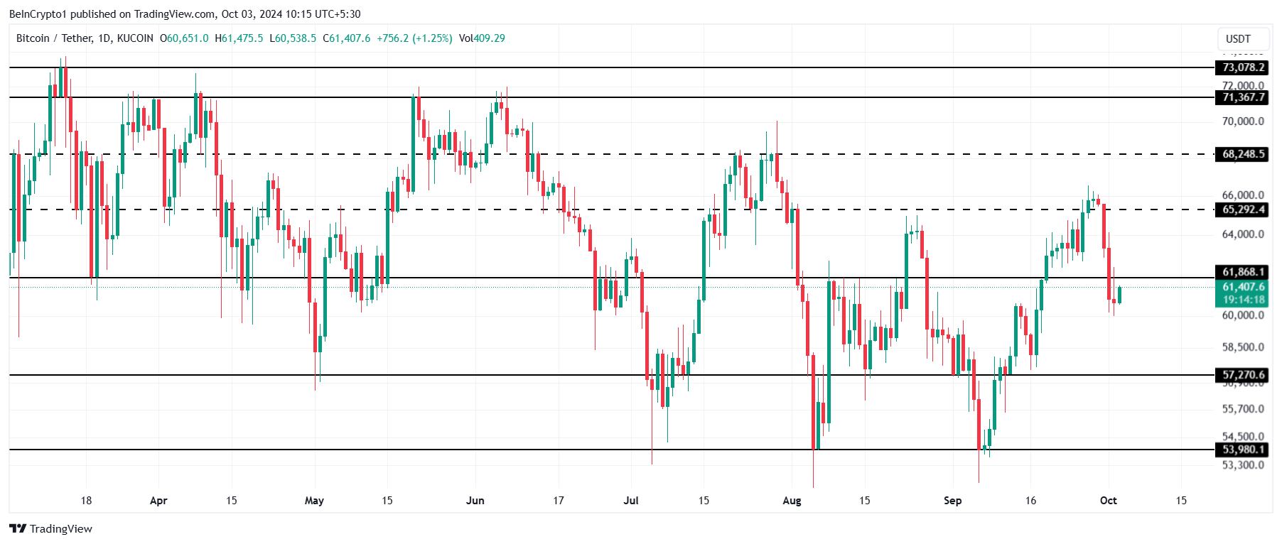 No entanto, a falha em romper a resistência de US$ 61.868 pode criar pânico entre os traders. Isso pode levar a vendas inesperadas, potencialmente levando o preço a US$ 60 mil ou menos, exacerbando o sentimento de baixa.