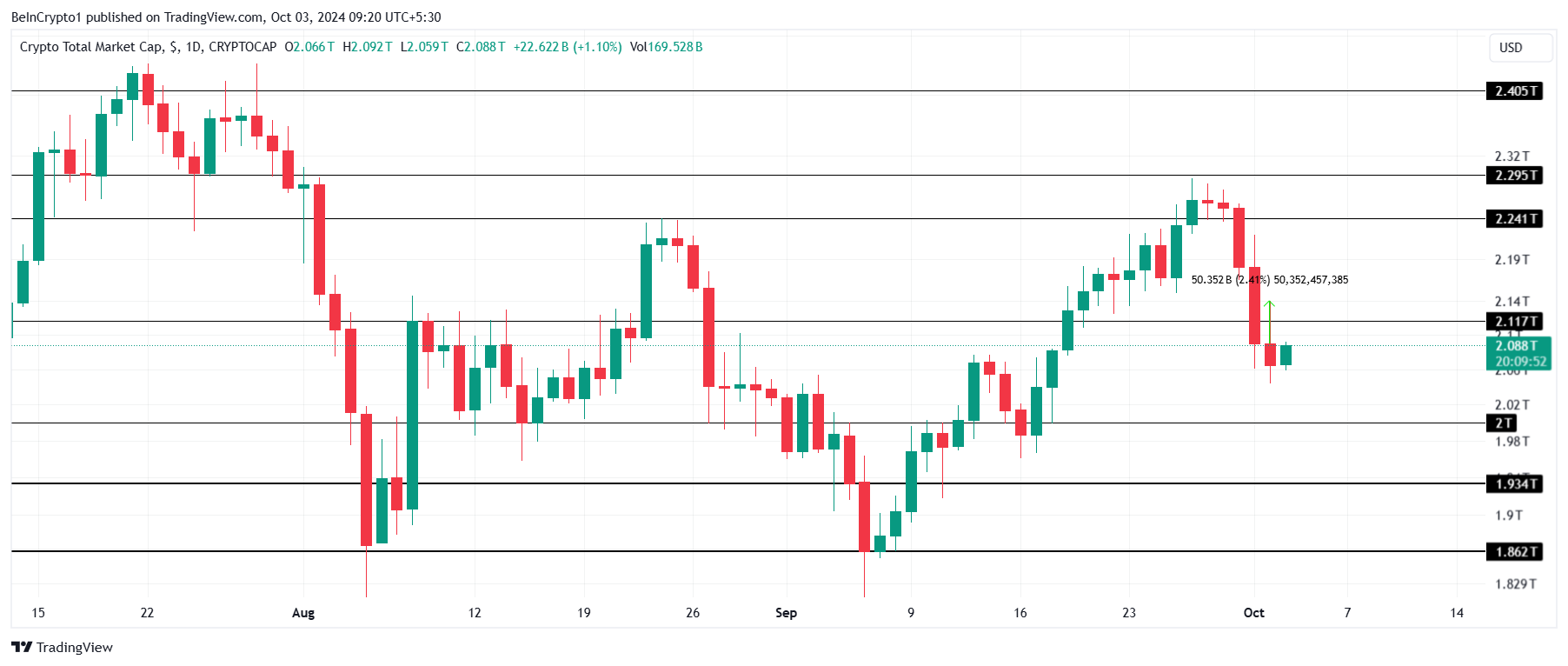 O mercado deve recuperar o nível de US$ 2,11 trilhões como suporte para recuperar a estabilidade. Isso pode permitir que o valor total se recupere ainda mais nos próximos dias, reforçando a confiança dos investidores em uma potencial alta.