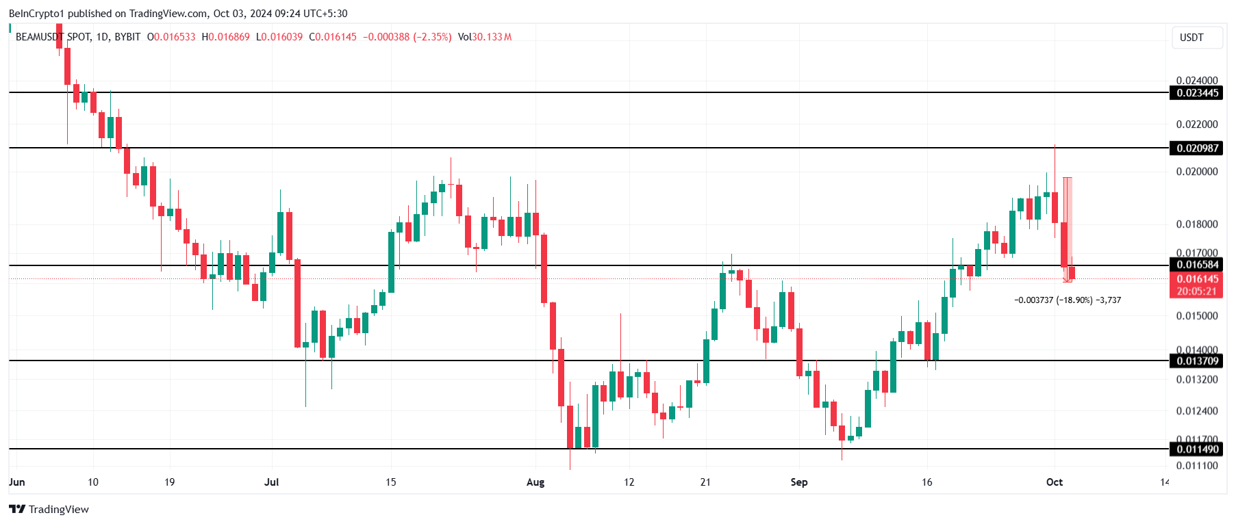 O preço do BEAM teve um declínio acentuado de 19% em relação à máxima intradiária de ontem, perdendo o nível de suporte crítico de US$ 0,0165. Essa queda repentina levantou preocupações entre os investidores, pois a altcoin luta para manter a estabilidade no mercado volátil.