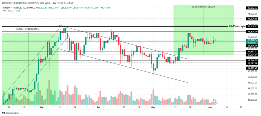 Com o Bitcoin negociado atualmente a US$ 68.818, parece que o ativo terá que esperar um pouco antes de poder subir para US$ 73.650. Este preço marca o máximo histórico atual e, para voltar a alcançá-lo, o BTC precisaria primeiro transformar a resistência de US$ 71.800 em suporte.