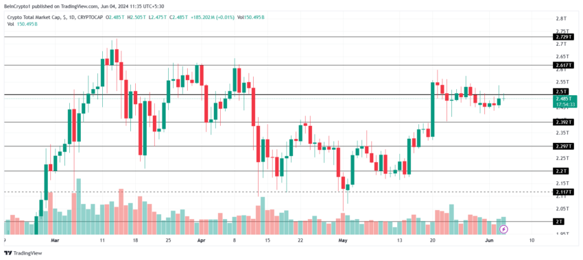 A capitalização total do mercado de criptomoedas está lutando para romper a resistência acima de US$ 2,50 trilhões e transformá-la em suporte.