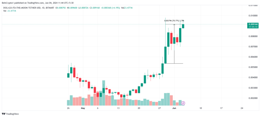 A euforia em torno das moedas meme não parece estar diminuindo. Um novo token, DOG GO TO THE MOON, tornou-se a altcoin com melhor desempenho nas últimas 24 horas. O ativo realizou um salto de 21% no período de um dia, passando de US$ 0,0074 para US$ 0,0091.
