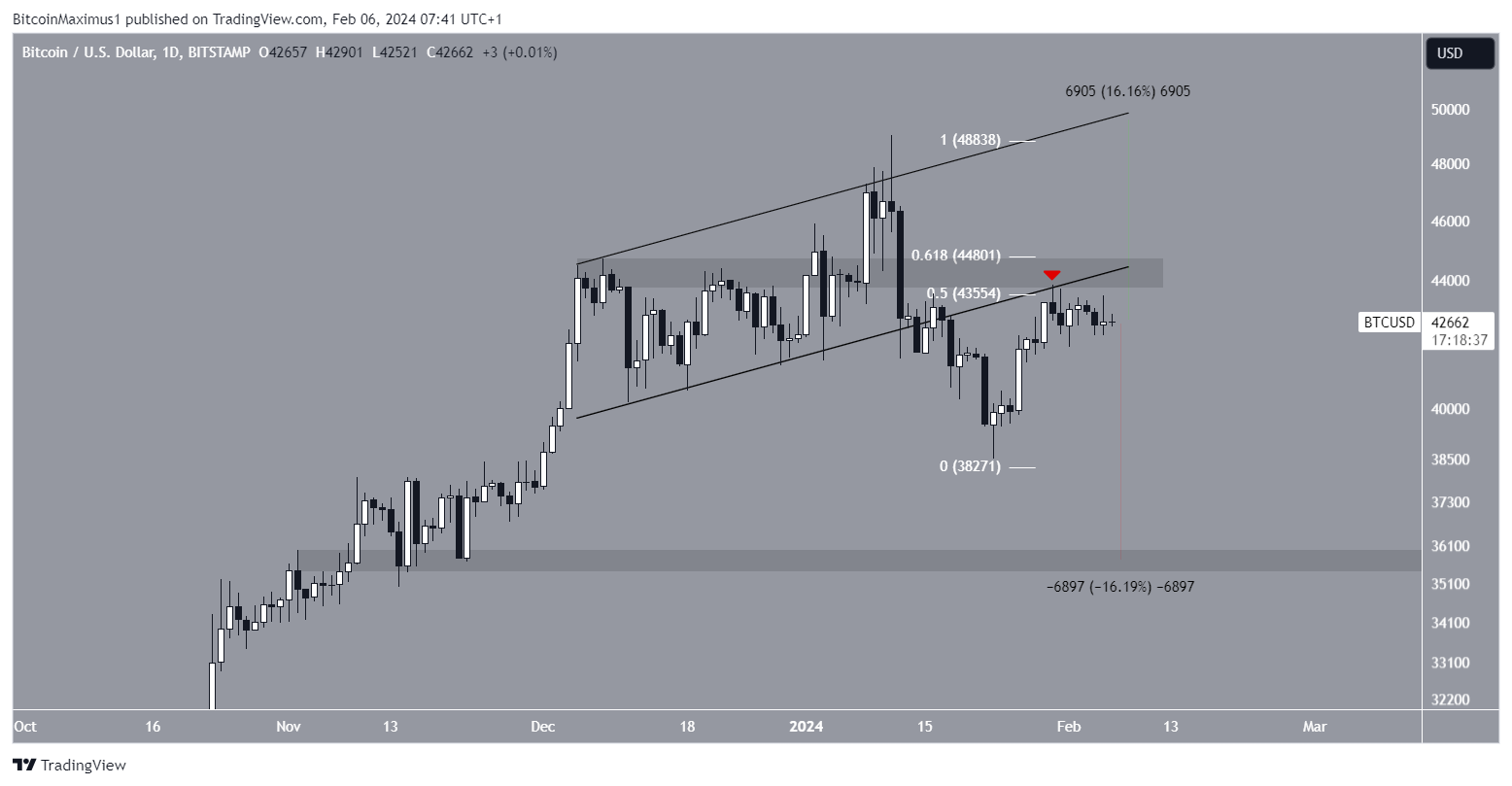 Depois de se recuperar em 23 de janeiro, o preço atingiu a linha de suporte do canal em 30 de janeiro (ícone vermelho). A linha coincidiu com o nível de retração de 0,5 de Fibonacci de US$ 43.500.