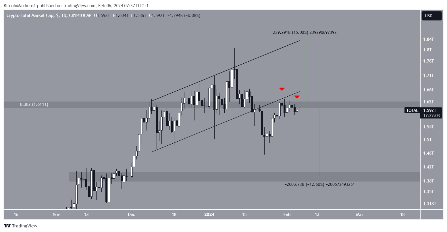 A capitalização total do mercado de criptomoedas estava dentro de um canal paralelo de alta desde 9 de dezembro de 2023. O movimento levou a um topo de US$ 1,81 trilhão em 11 de janeiro.