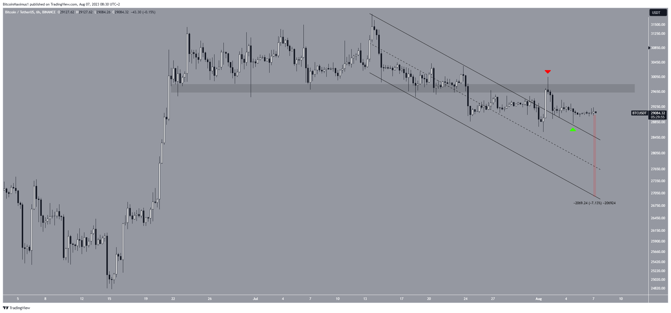 Após atingir uma máxima anual em US$ 31.800 em 13 de julho, o preço do BTC seguiu um canal paralelo de baixa, levando a uma mínima de US$ 28.585 em 1º de agosto. No entanto, o preço experimentou uma recuperação e saiu do canal no dia seguinte.