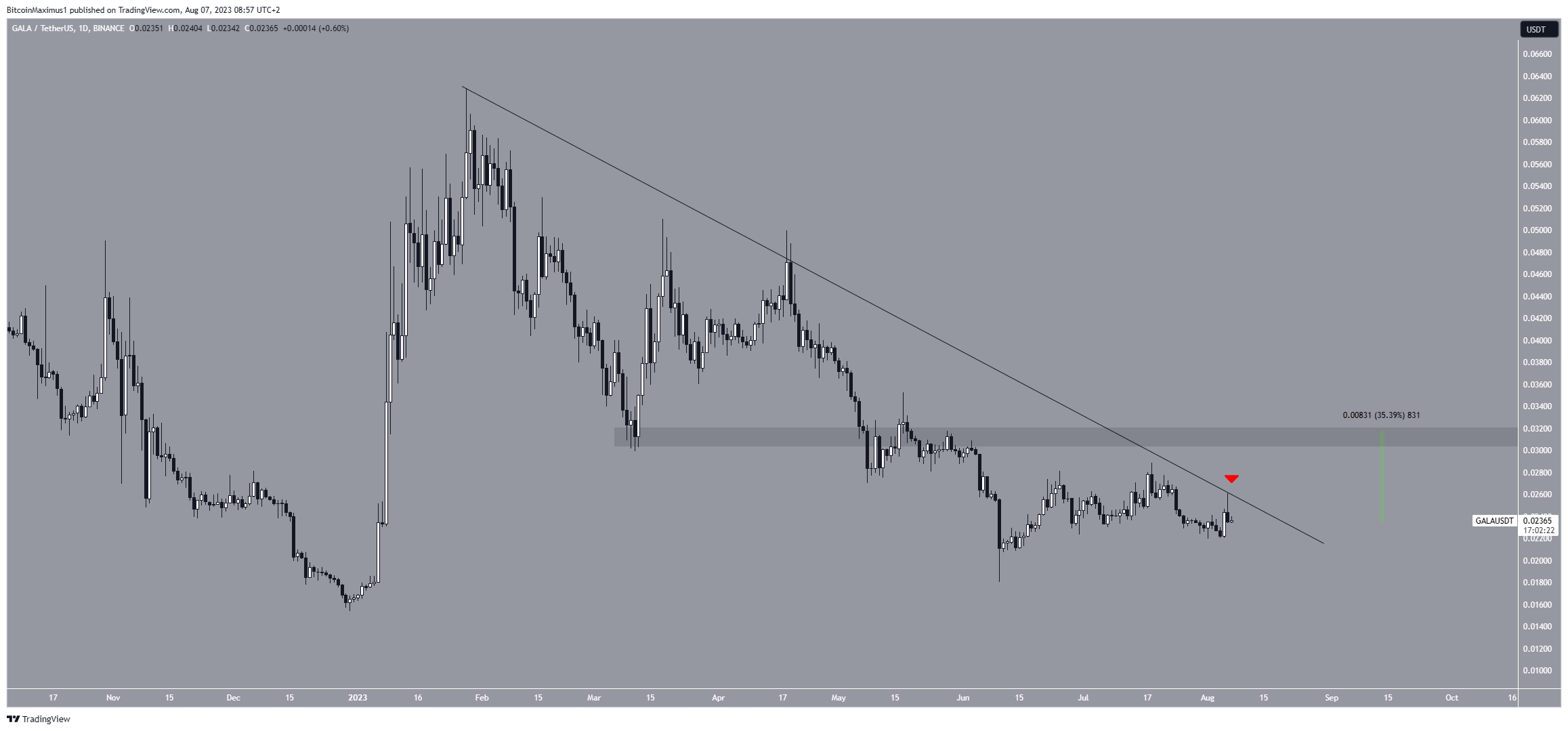 O preço do GALA caiu sob uma linha de tendência de baixa desde o início de fevereiro. A queda levou a uma baixa de US$ 0,018 em 10 de junho. Isso foi apenas um pouco acima da baixa anual de US$ 0,015.