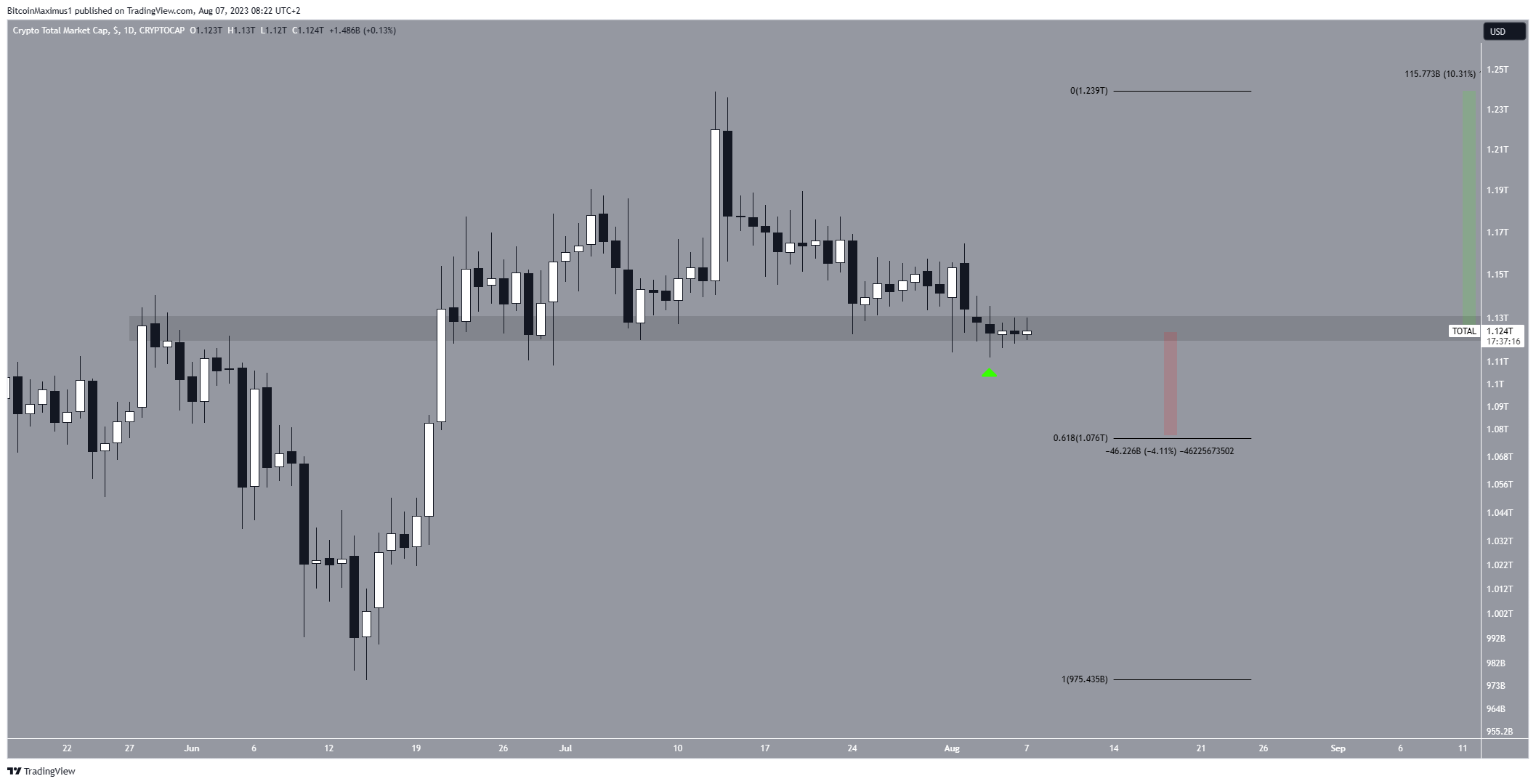 O TOTALCAP experimentou um declínio após atingir seu pico de US$ 1,24 trilhão em 13 de julho. A tendência de queda continuou até 4 de agosto, quando atingiu uma mínima de US$ 1,11 trilhão.
